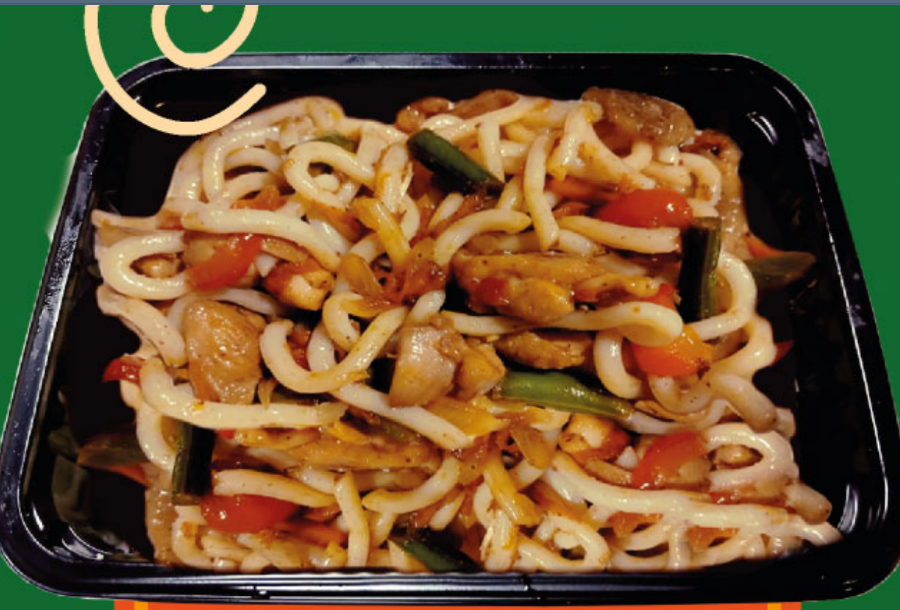Лапша Удон, соус Вок, тушеные овощи (брокколи, фасоль стручк, помидоры, перец болг, лук), курочка Гриль.