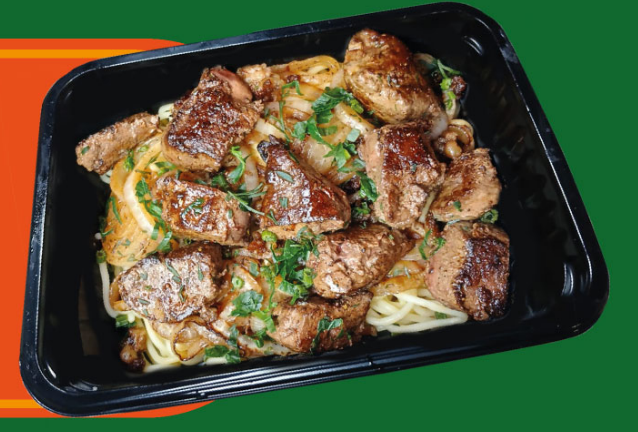 Печень прожарки Медиум Велл, лук гриль, лапша или картофель Айдахо