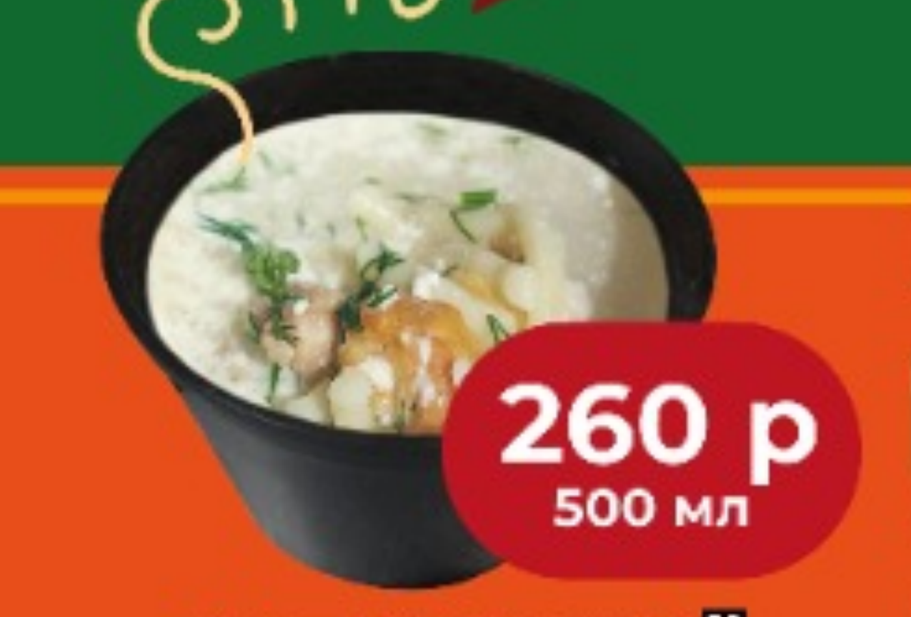 Мясной бульон, овощи, курица гриль, соус сливочный, зелень. Подаётся со свиным шпиком и жареным тостом.
