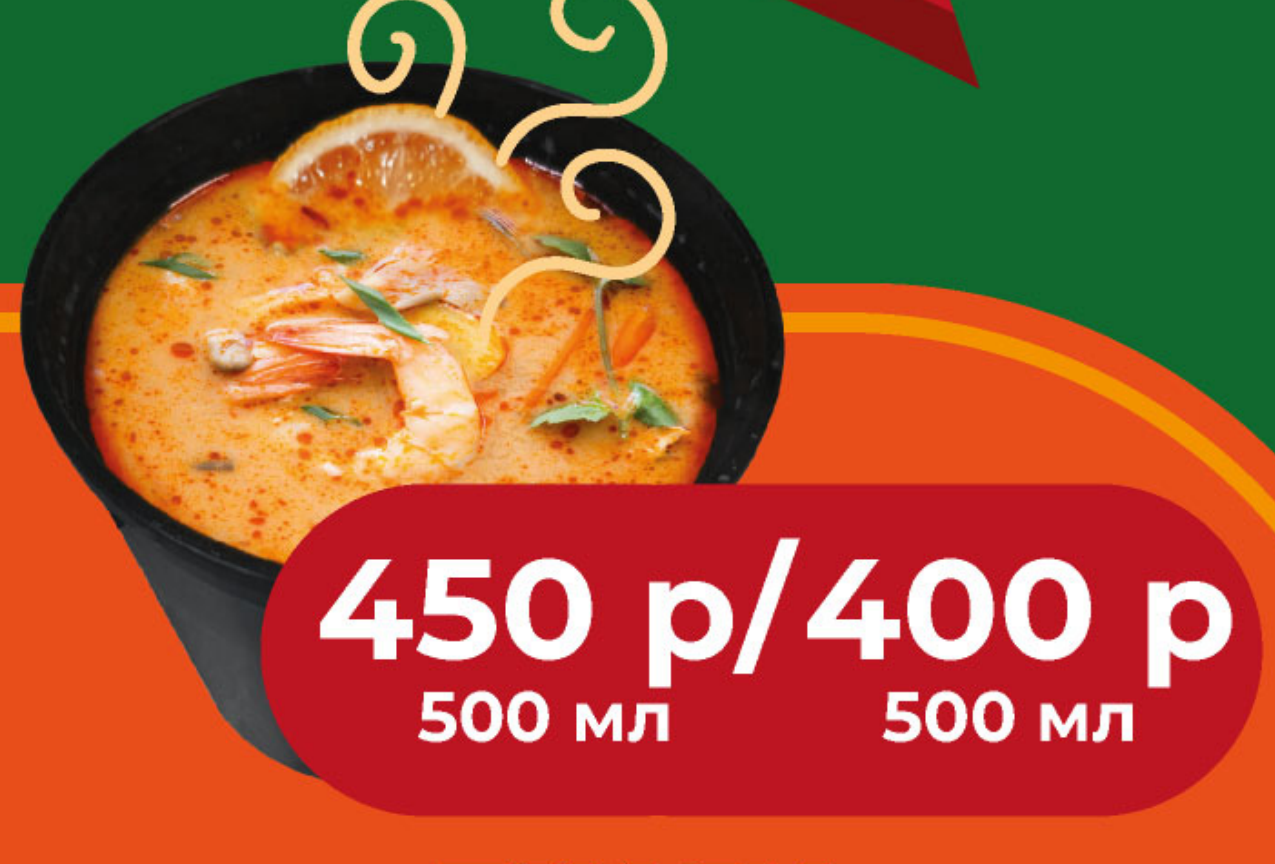 Рисовая лапша, шампиньоны в сливках, бульон том-ям, сливки, Черри, нури, (креветки 4шт или курица).